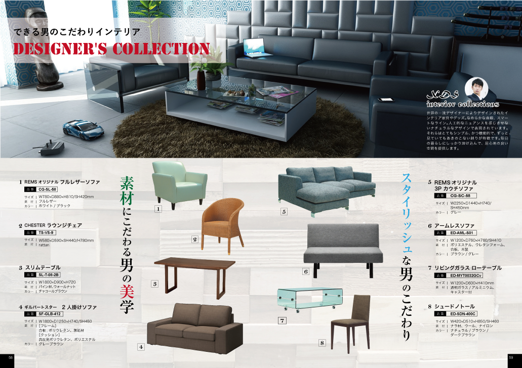 | 制作ポイント | 左右のページに拘りのポイントとして、「素材にこだわる男の美学」「スタイリッシュな男のこだわり」というキャッチコピーを付け、家具のアプローチを行いました。 |