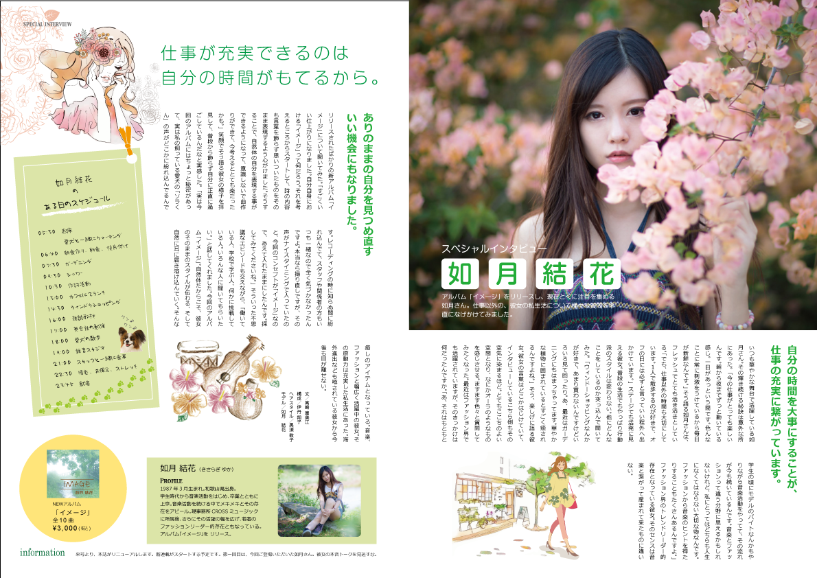 | 制作ポイント | 「仕事が充実できるのは自分の時間が持てるから」 というテーマで如月結花のインタビュー記事の雑誌制作を行いました。